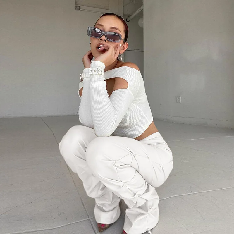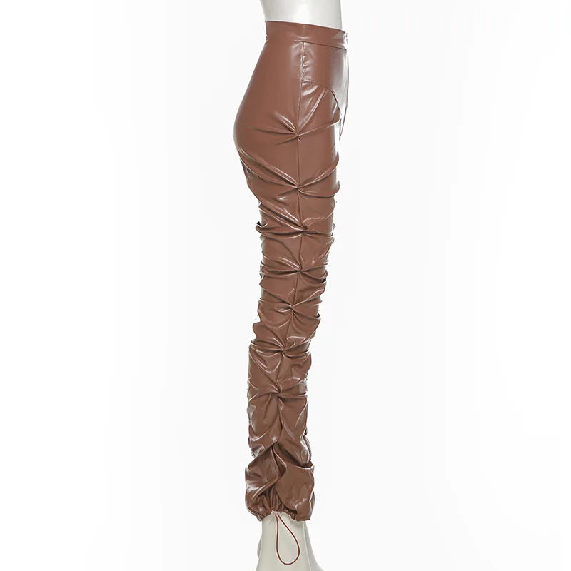 OUDINA Fashion Street High Waist Casual Trousers Zipper PU Pleated Brown Stacked Pants Women Leather Pants
