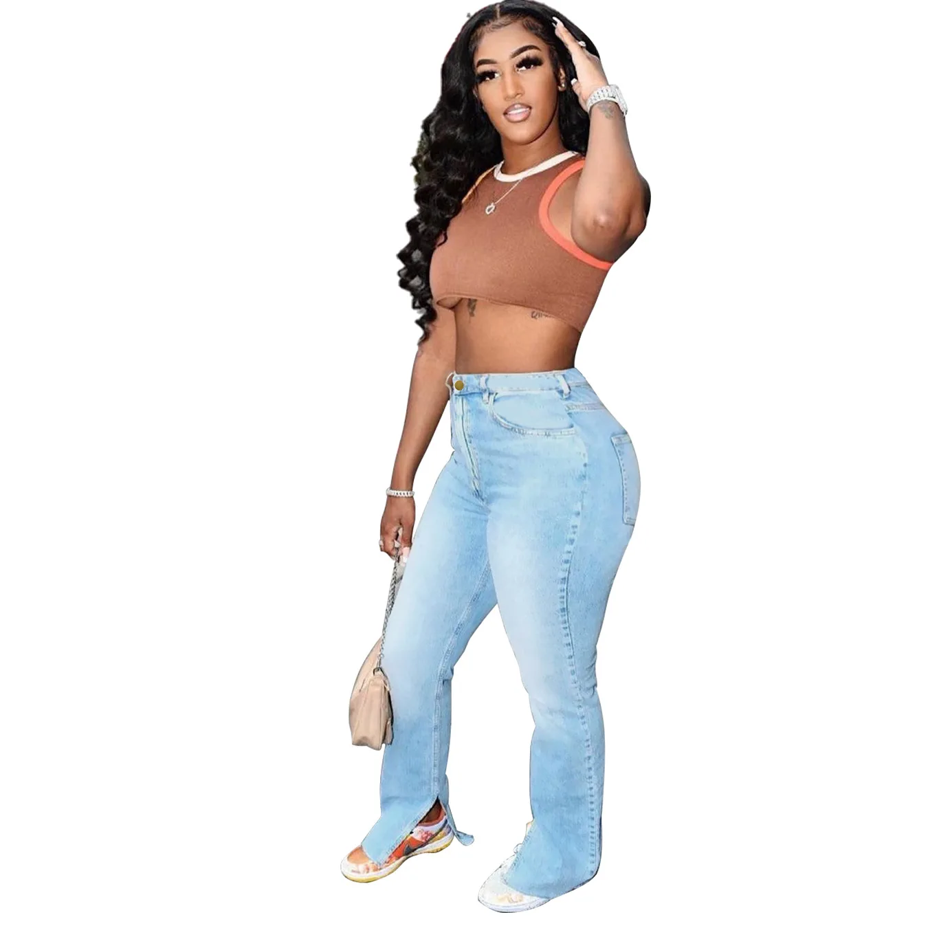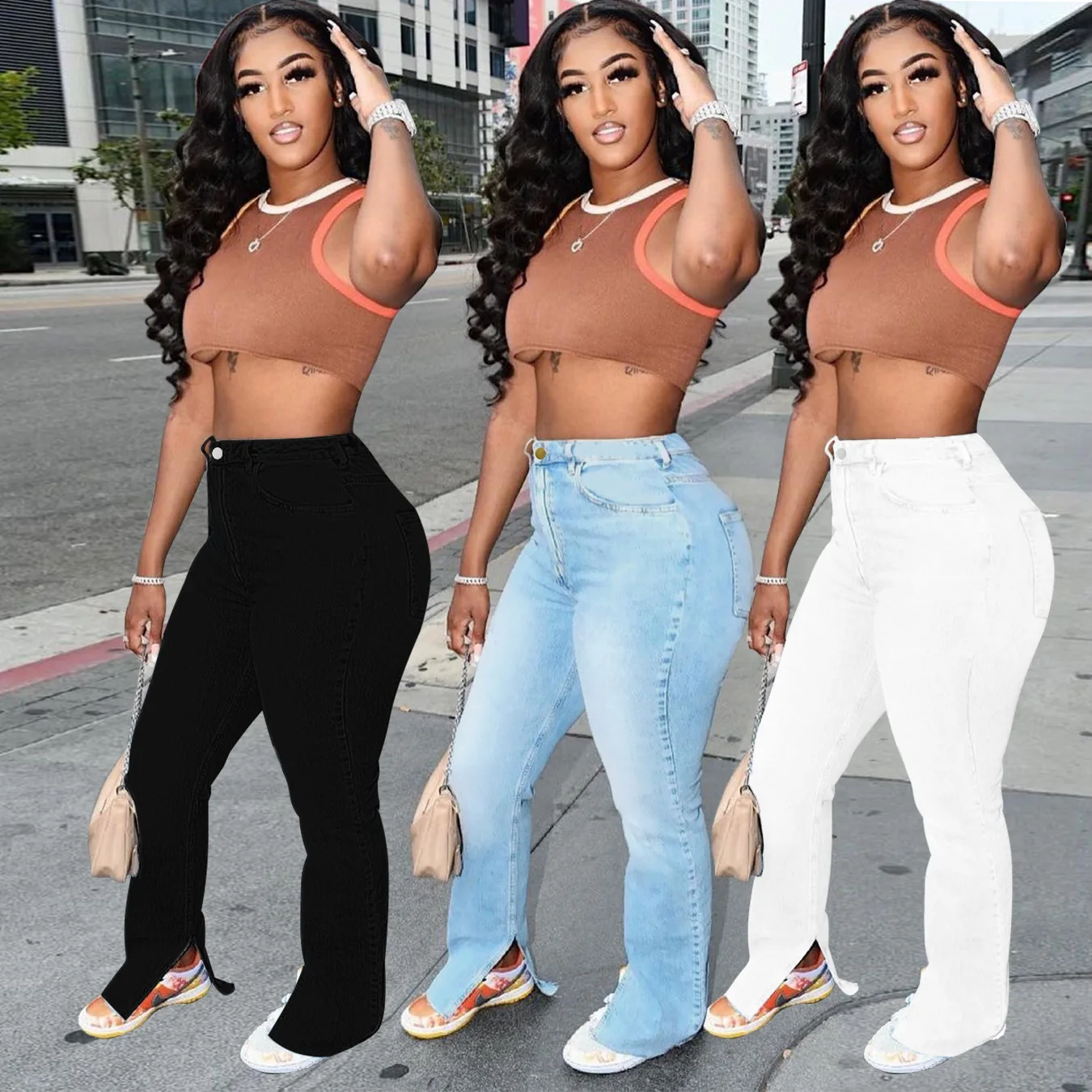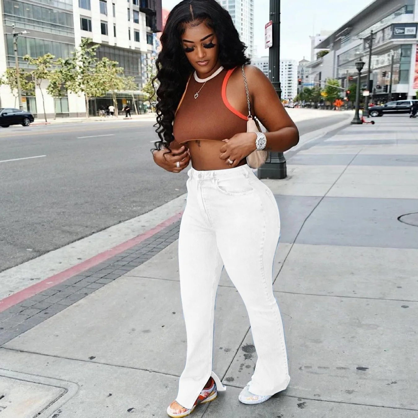 The Bad Chic High Waist Stretch Denim Jeans Full Length Split Bottom Flare Jeans
