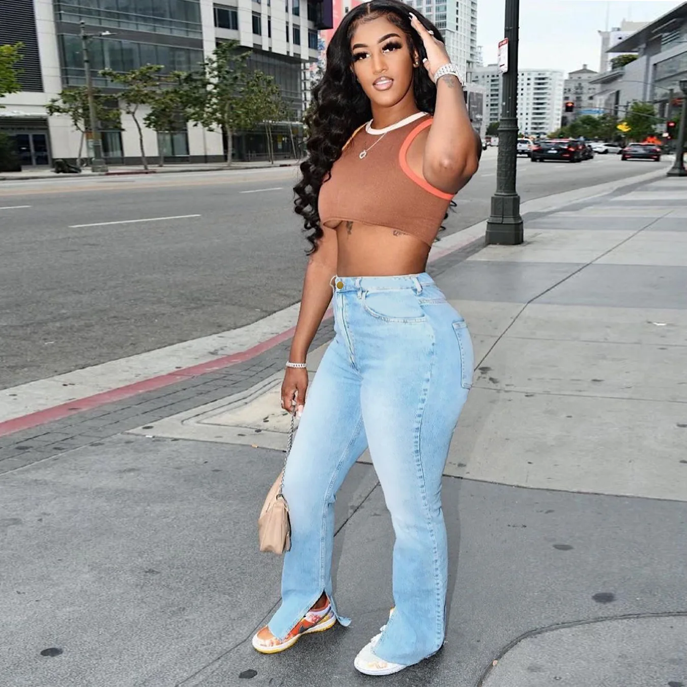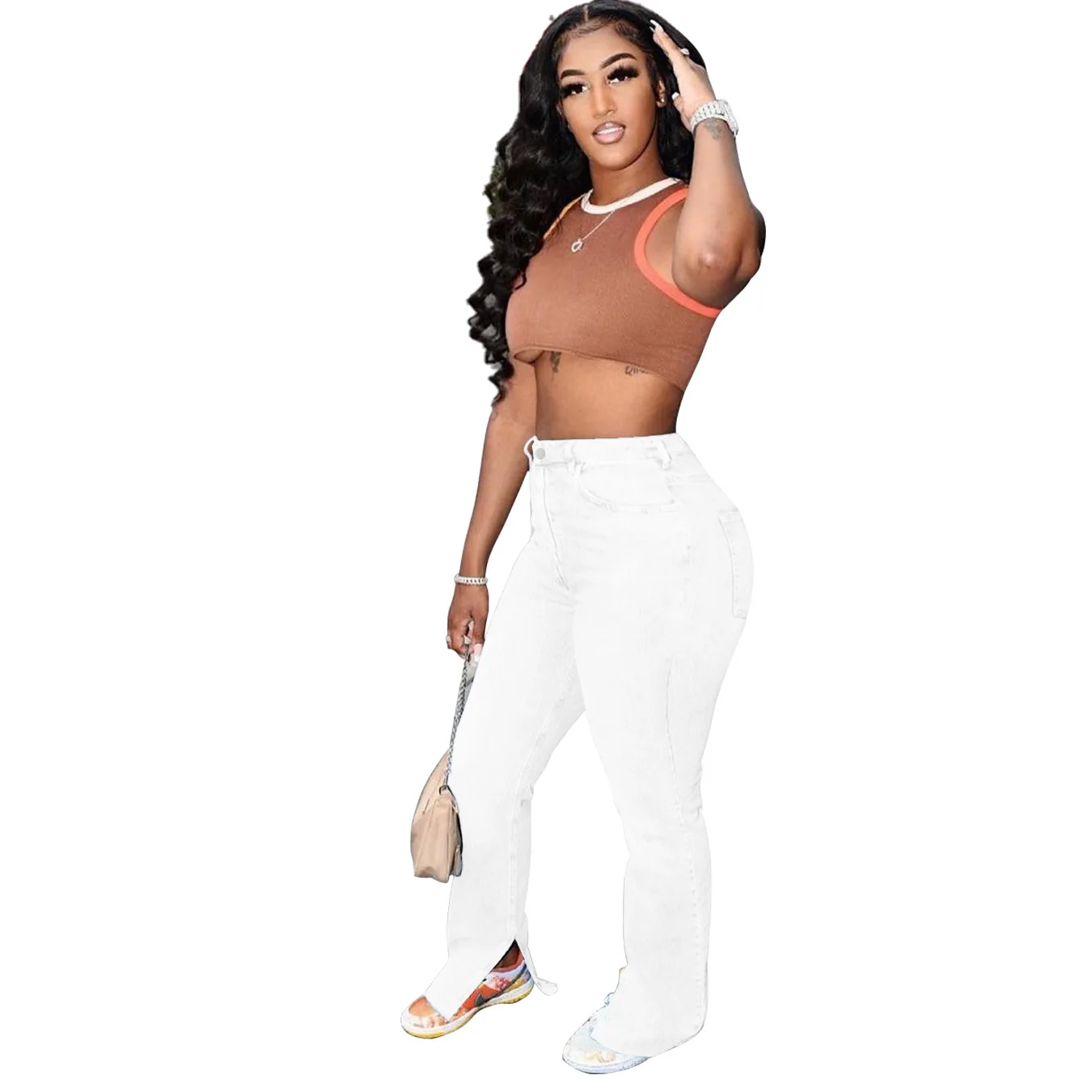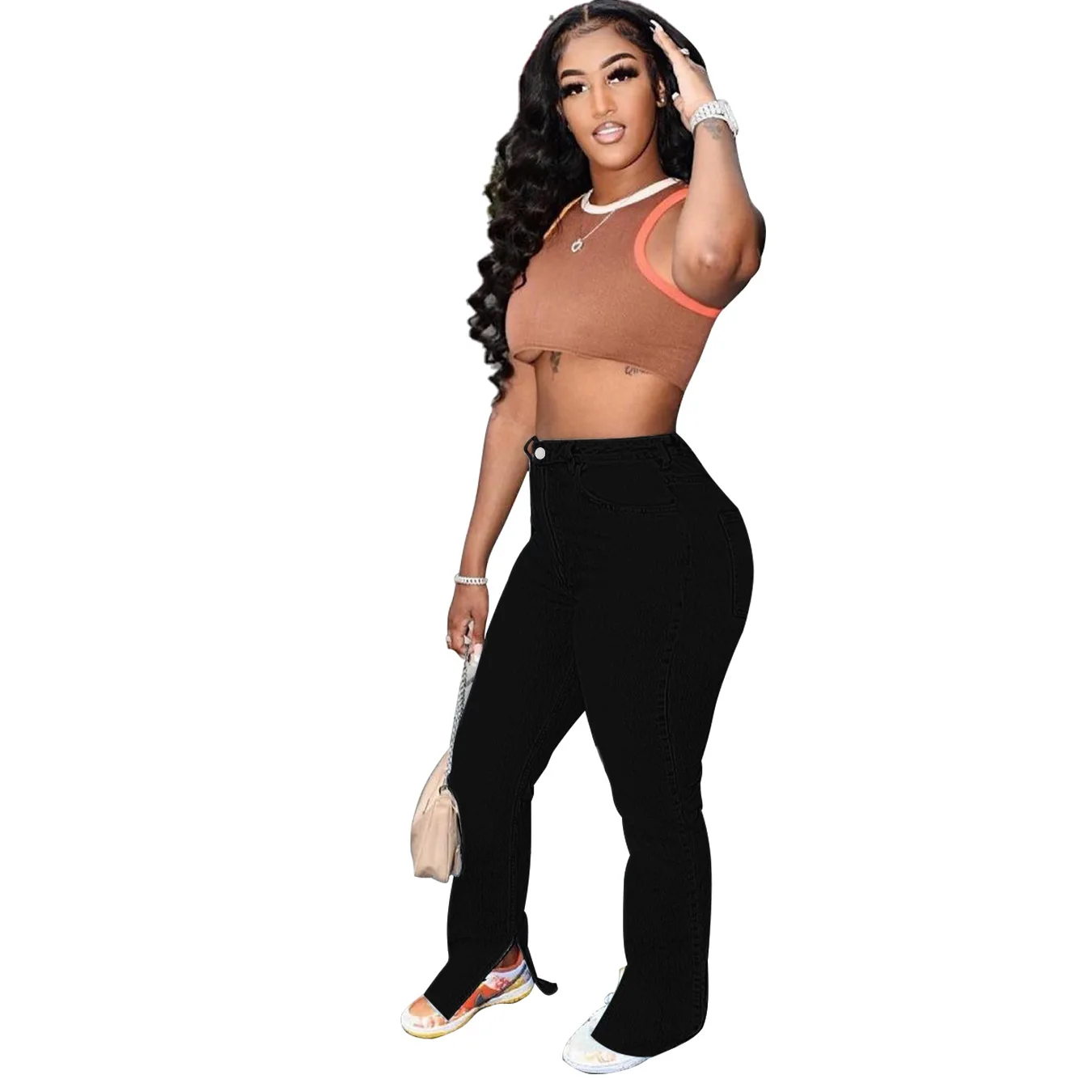 The Bad Chic High Waist Stretch Denim Jeans Full Length Split Bottom Flare Jeans